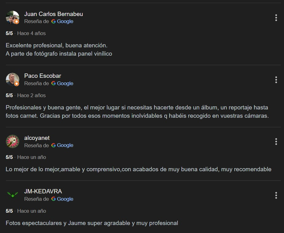 Somos una empresa de fotógrafos profesionales ubicada en Alcoy, en la hermosa provincia de Alicante, con más de 28 años de experiencia capturando los momentos más especiales de la vida. Nos apasiona la fotografía y nos dedicamos a ofrecer un servicio integral, desde reportajes de bodas, eventos y sesiones personalizadas, hasta la creación de lienzos fotográficos de alta calidad para que puedas inmortalizar tus recuerdos de una forma única. Nuestro compromiso es plasmar emociones y crear imágenes que cuenten historias, siempre con un trato cercano y resultados excepcionales. ¡Estamos aquí para convertir tus momentos en arte!